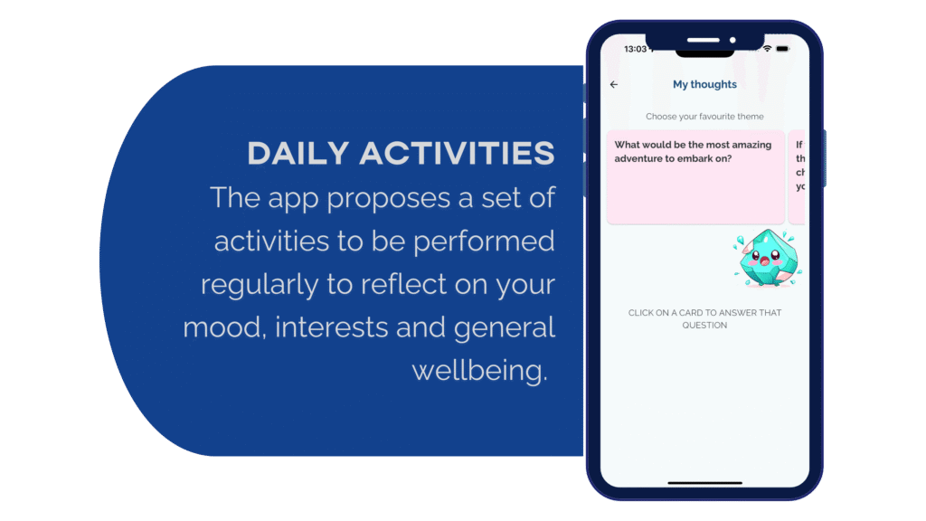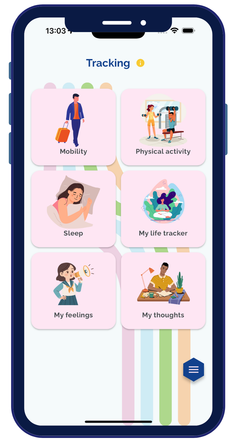 Through features such as voice recording and text input, the app aims to analyze user interactions to discern mental states. Additionally, users can engage with the My Life Tracker questionnaire or (optionally) with the Ecological Momentary Assessments to reflect on their feelings.