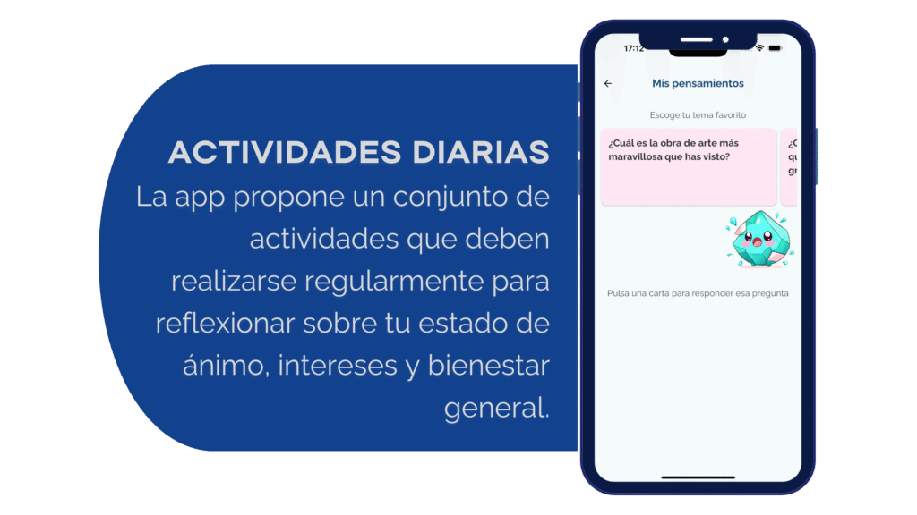 A trav茅s de funciones como la grabaci贸n de voz y la entrada de texto, la aplicaci贸n tiene como objetivo analizar las interacciones de los usuarios para identificar estados mentales. Adem谩s, los usuarios pueden interactuar con el cuestionario My Life Tracker o (de forma opcional) con las Ecological Momentary Assessments para reflexionar sobre sus sentimientos.
